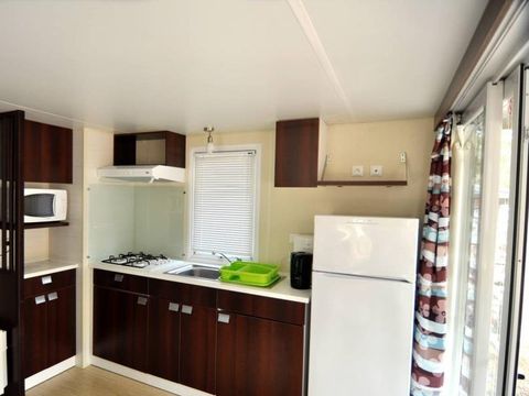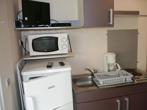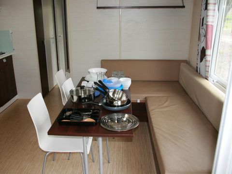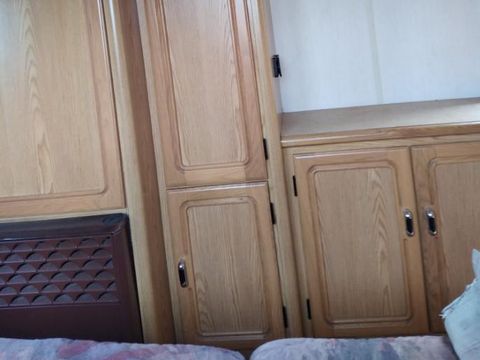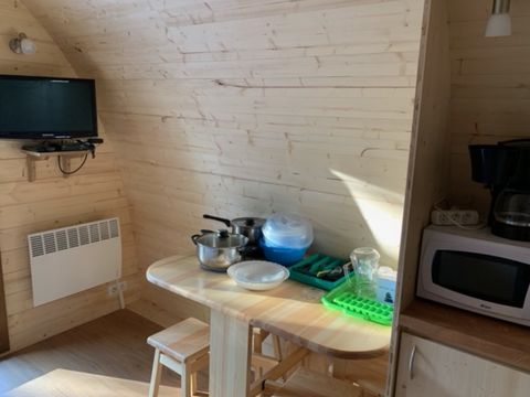 La vaisselle : manque une petite poêle des assiettes à déssertquelques verres plus grands éventuellement... et des muggs a l'occasion. Les matelas sont très bons et très propres. La salle d'eau est super car la douche est grande. Et en dernier des pateres pour torchons et vêtements . Sinon c'est super comme camping. Merci nous avons passé un excellent séjour.
